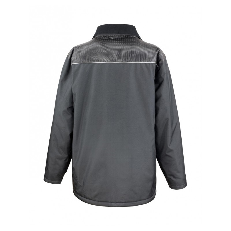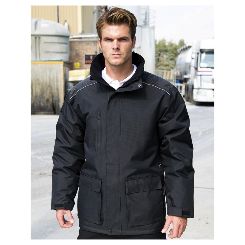 Veste longue de travail homme. Protection contre la pluie et le vent. Poches plaquées avant avec déverrouillage rapide et entrée latérale, Ext: 100% polyester Oxford 300D avec enduit PVC, doublure: 100% polyester Taffetas 210T (damassée en losanges), rembourrage: 100% polyester, résiste au vent et waterproof (2.000 mm), coutures soudées, capuche ajustable et amovible, col doublé en tricot doux, fermeture à glissière avec 4 taquets interchangeables avec rabat tempête, poignets réglables par fermeture auto-agrippante, passepoil réfléchissant, accès à la décoration à la potrine et au bas du dos, convient à la broderie et au transfert.