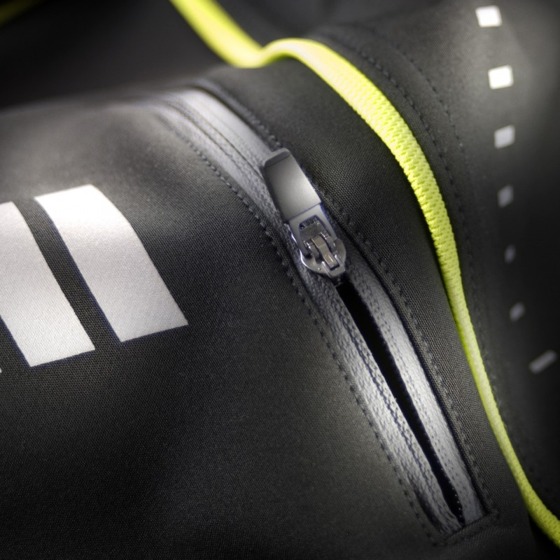 Poignets et panneaux latéraux: 92% polyester, 8% élasthanne. Résiste au vent et waterrepellent, respirant. Orifice pour le pouce aux poignets. Détails réfléchissants à l'avant et à l'arrière. Dos plus long. Sortie média, poche à l'arrière avec fermeture à glissière étanche. Coupe cintrée. Convient à la broderie.